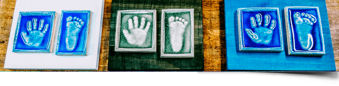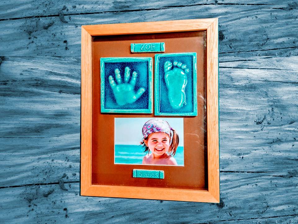 Servicio profesional de impresión de huellas de bebé sobre arcilla, en nuestra tienda y a domicilio en Valencia y Madrid.Con acabado de las huellas en alto relieve y cerámica de alta calidad. Enmarcadas con los colores que elijas y rótulos con su nombre y edad. También para regalar en el bautizo. Entregamos las huellas de tu bebé en cuatro semanas