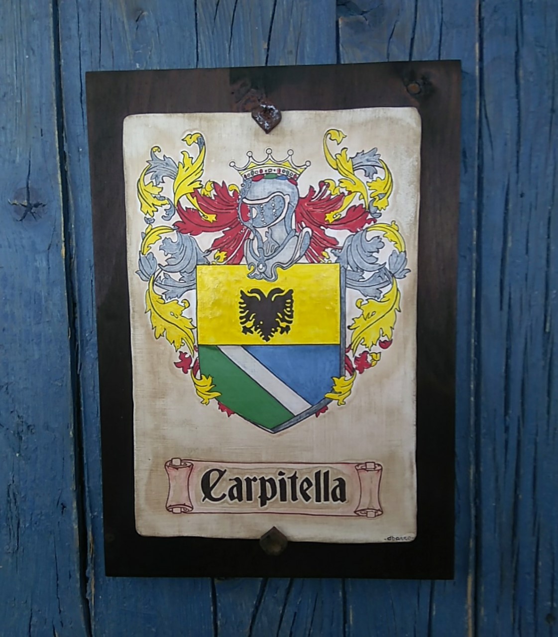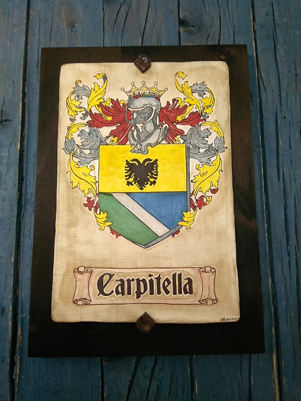 Nuestros escudos heráldicos están pintados a mano por Marisa Álvarez sobre azulejo manual de 20x30cm, envejecidos y fijados sobre tabla de madera para colgar.