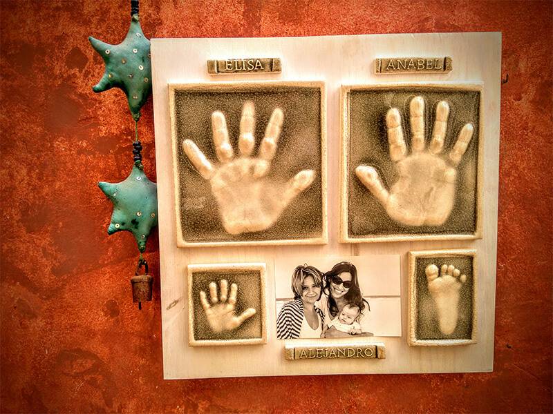Hacemos las huellas sobre una placa de arcilla especial donde se marcan todos los detalles de sus manos y pies. Sacamos el molde y lo reproducimos en altorrelieve con los esmaltes de color que elijas.