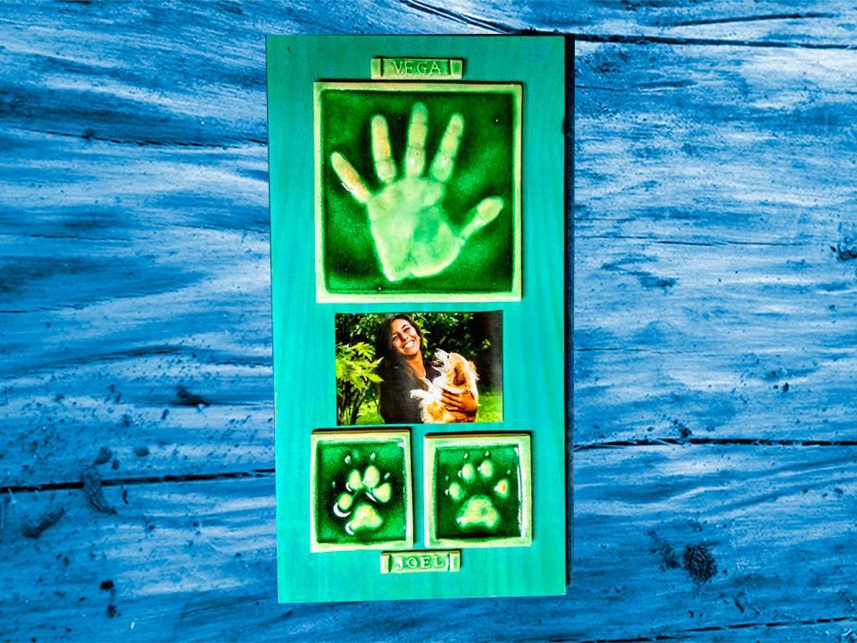 Realizamos huellas de niños y adultos en ceramica y podemos hacer una composición con tu huella y las de tu hijo, con una foto bonita de los dos queda genial.